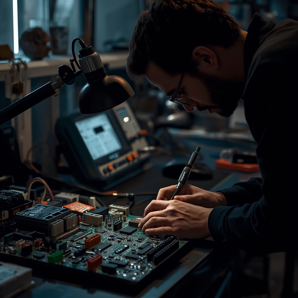 Precyzyjna naprawa w laboratorium elektronicznym z oprzyrządowaniem przemysłowym.